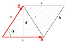 Скалярное произведение (англ. dot product) двух векторов равно произведению их длин и косинуса угла между ними. Для него справедлива следующая формула: