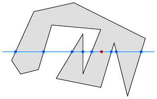 Если посчитать число пересечений с многоугольником, то для точки, находящейся внутри, это число будет нечетным («наружу-внутрь-наружу», 3 пересечения), в противном случае — четным.