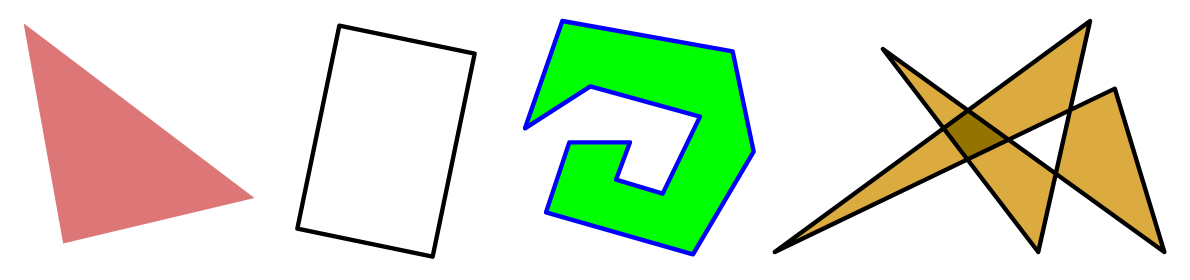 Многоугольник называется простым, если граничная ломаная не имеет точек самопересечения. На картинке все многоугольники кроме последнего являются простыми.