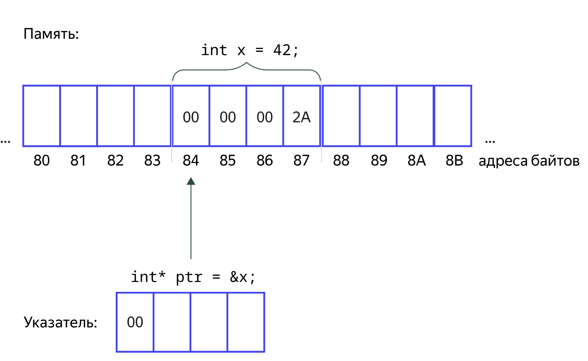 int* ptr = &x;  // сохраняем адрес в памяти переменной x в указатель ptr